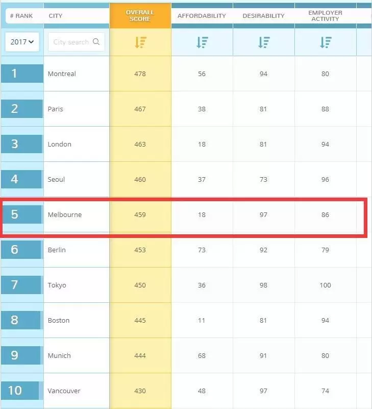 世界顶级留学城市没有澳洲的城市? 不存在的。 澳洲毫无疑问地会上榜世界最佳留学城市TOP10。而澳洲最佳的留学城市就是~ 墨~尔~本~ Melbourne 而这次的世界留学城市排名,QS严格按照以下几个维度来进行评选。 AFFORDABILITY 承受力 DESIRABILITY 期待值 EMPLOYER ACTIVITY 就业能力 RANKINGS 排名 STUDENT MIX 学生的多样性 student view 学生看法 在这几个维度的综合下,墨尔本拿下了世界第五,澳洲第一的成绩。不愧是“喵本”~ 我们不难发现,top1到top10 的总分差距都不算大,排名第5的墨尔本距离第一也相差不到20分。 而墨尔本最致命的一个掉分项就是: 和第一名直接差距38分。 理由是什么? 理由是:QS认为,墨尔本近几年人口暴增,尤其是留学生的数量,实在是太多了!根本不能再容纳太多的学生了!墨尔本你这样是不可以的! 墨尔本能说什么? 当然还是让120万澳洲华人中的一批墨尔本华人继续认真生活啦~ 除了这个bug之外,其实墨尔本在整个留学生群体口碑极高。 那是当然的啦~ 毕竟,喵本是如此地有魅力! 世界最宜居 作为世界最宜居或者第二宜居的世界级城市,人们喜欢墨尔本浓郁的世界文化包容万千气息。 它可以古典。 它也可以很摩登。 它还可以很潮很酷炫。 它也可以很自然。 freestyle起来也是不在话下。 当然,对留学生来说,最主要的当然不是这个,而是墨尔本那一个又一个的世界名校! 留学圈无人不知无人不晓的一个集能力与傲娇与一体的世界顶级大学。 世界排名永远在世界top50。 同时它自己心中永远第一。 在商科、法律、建筑、文学、教育、工程、医学等都很厉害。 澳洲最爱搞事的大学。 澳洲八大名校之一, 同时也是八大里面门槛最低的大学。 同时也是八大里面挂科传闻最多的大学。 2018QS世界大学排名排在60名。 优势专业包括教育,计算机,会计等。 澳洲艺术NO.1的大学,; 就业率超高的大学; 优势专业包括IT,动漫设计,园林景观设计,平面设计等。 澳洲人民特别喜欢的大学; 会计专业不用说,很棒! 优势专业有会计,运动管理,营养学等。 整整7所世界名校在这个城市汇聚,我们就可以知道它为什么会成为世界留学城市top5。 而出国留学,除了学习之外,还有一个很重要的事情就是: 它决定了你二十几岁住在哪个城市。 只要你是年轻人,你就会知道这句话的分量。 墨尔本,是充满香气的的咖啡馆,是放纵不羁的涂鸦墙,是悠哉自由的街头艺术家,是踩着滑板呼啸而过的年轻人。 你有没有想过,如果你的二十几岁没有在这里住过,你会不会后悔? 如果你二十几岁在这里住过,你的人生会不会不一样。 你的工作,你的生活,你的眼界,你的人生会不会有什么不同? 去一次墨尔本你就知道。